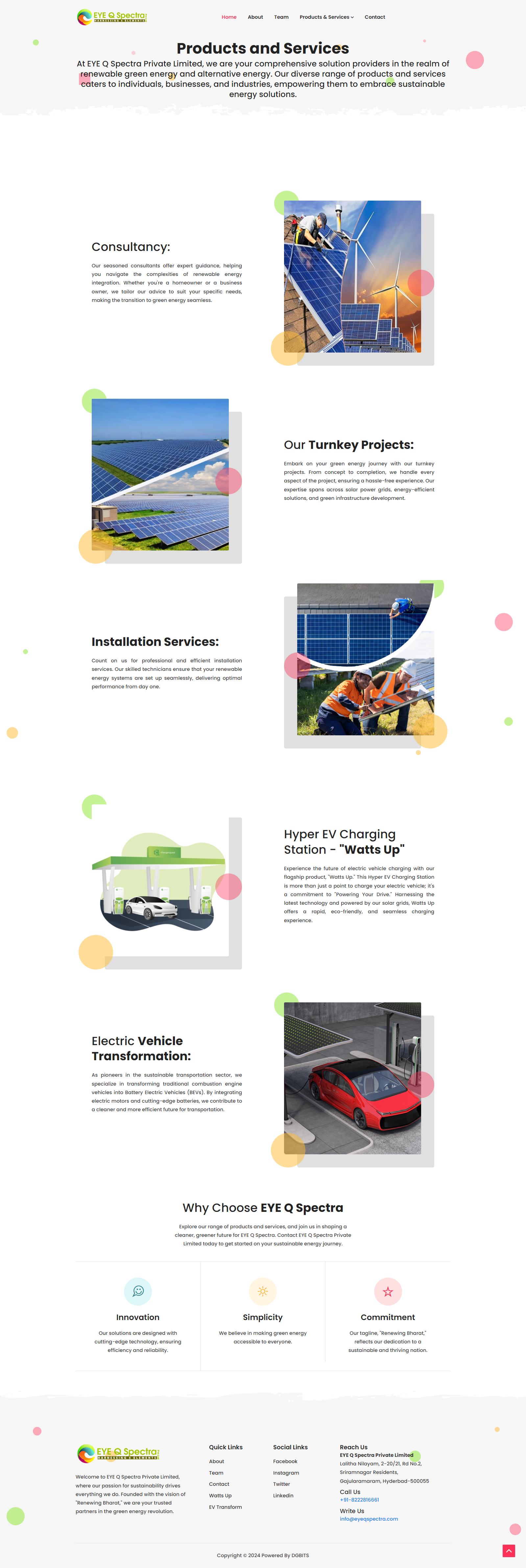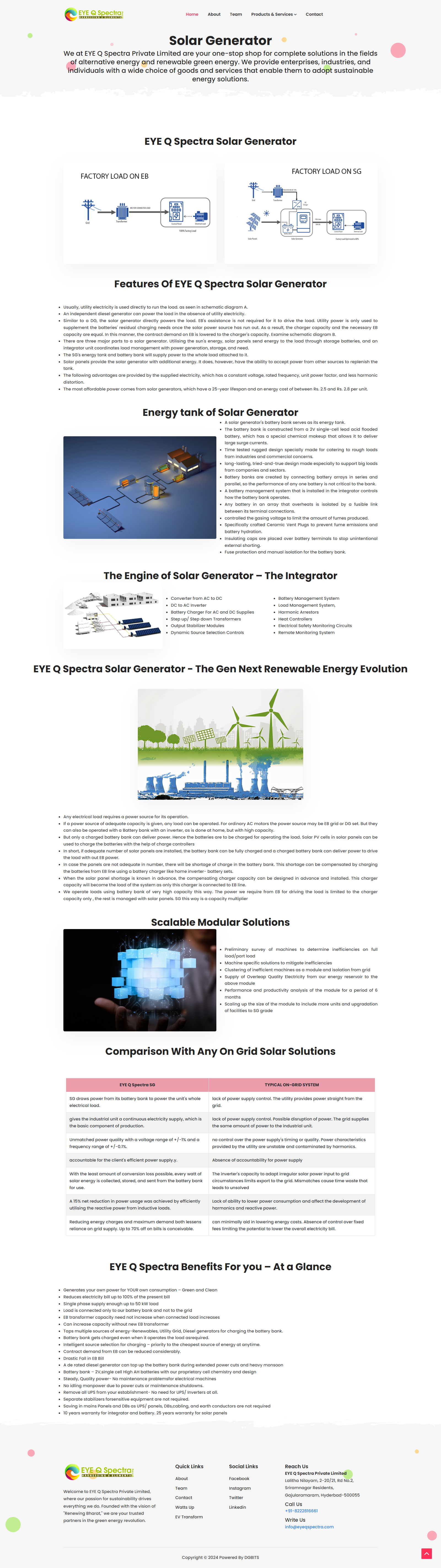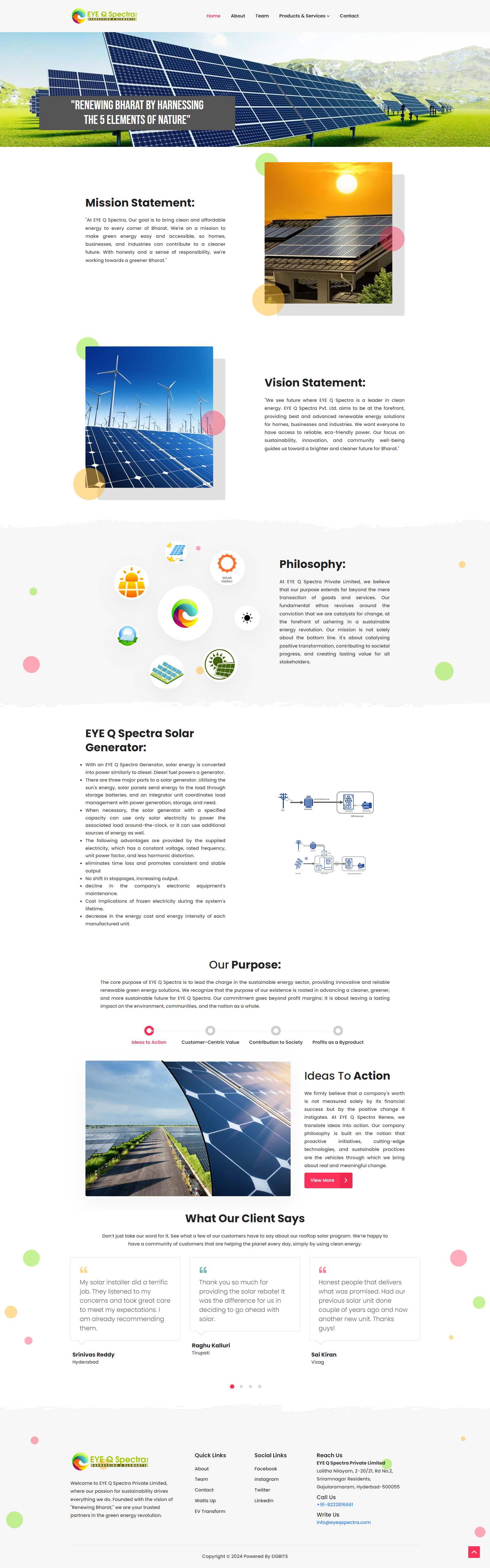 Overview EYE Q Spectraa Private Limited, a forward-thinking company in the renewable energy space, needed a website that could reflect their expertise in green energy solutions and alternative power technologies. Their goal was to educate visitors, showcase completed solar projects, and capture client leads—while ensuring the platform remained scalable and environmentally conscious in its design.