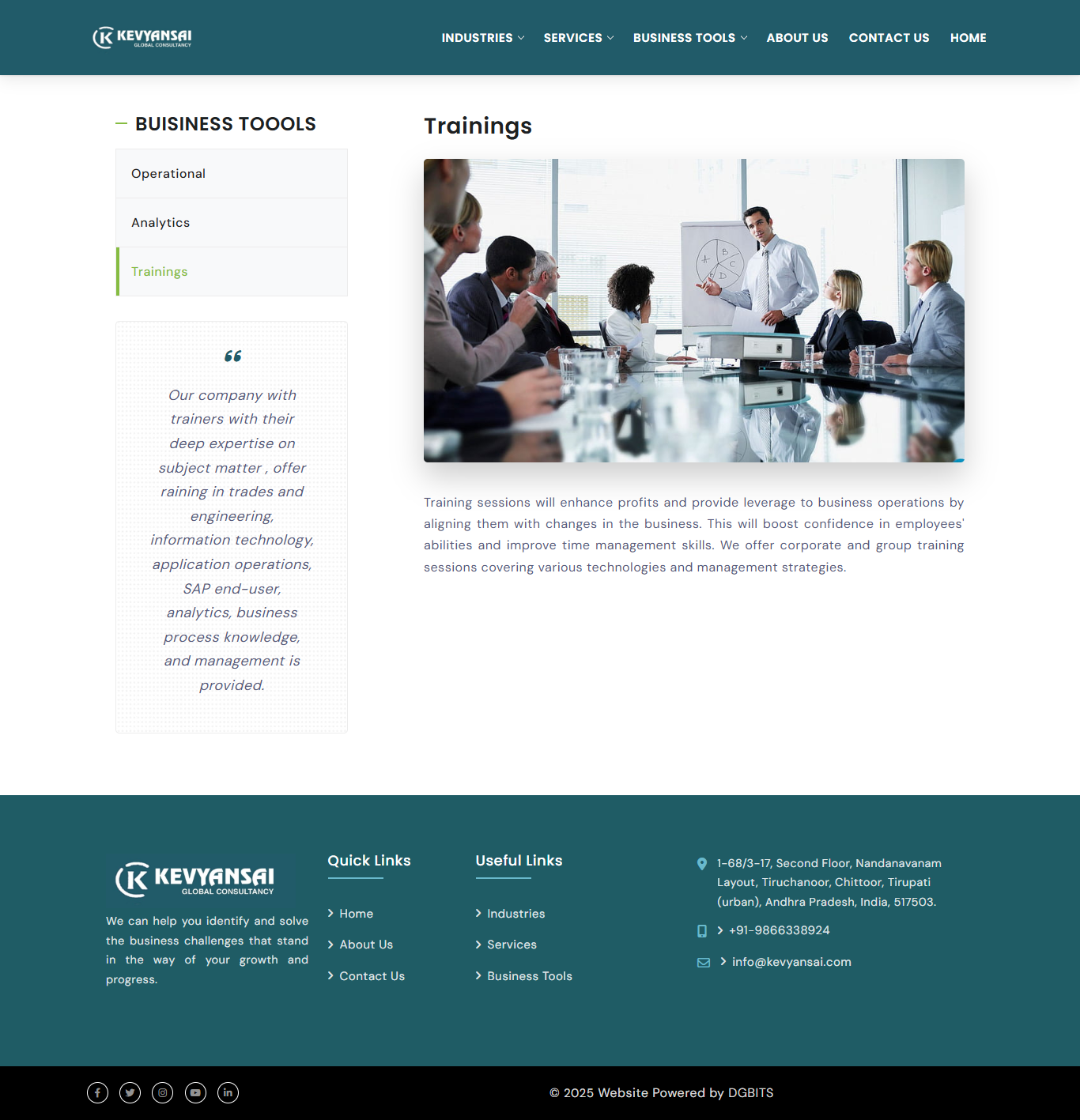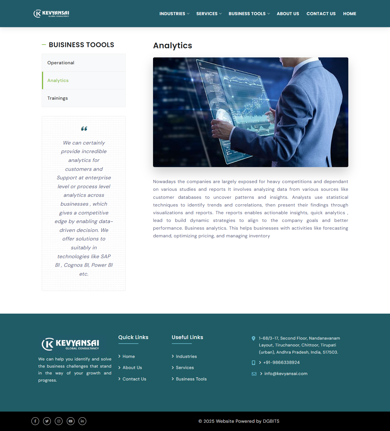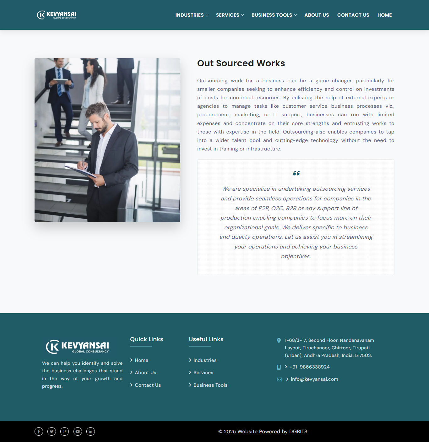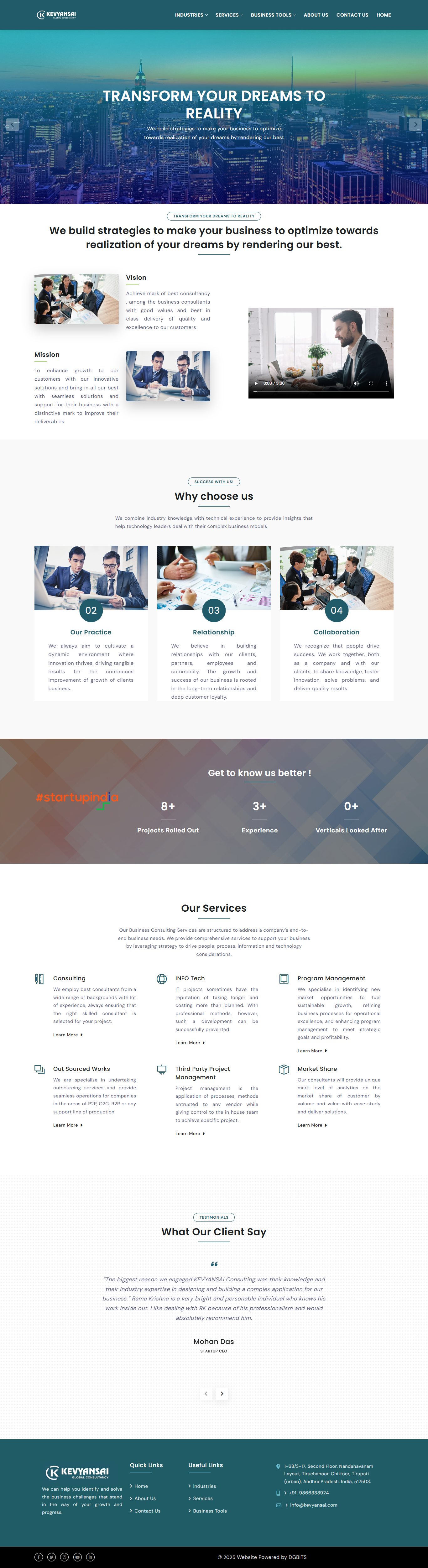 At Kevyan Sai, We have experienced senior management with strategic expertise, exceptional analytical skills, strong leadership abilities, and proficiency in project management. Our collaborative approach enables us to effectively lead teams and successfully manage multiple projects across various verticals and industries. Kevyan Sai known for great service and expertise in numerous industries. Their original website was outdated and slow to load, which was leading to a high bounce rate and lost business opportunities. Ultimately, it didn’t reflect their modern service offering. DGBITS was brought in to create a new digital strategy that showed their biggest assets as a business and provided a path to more conversions.