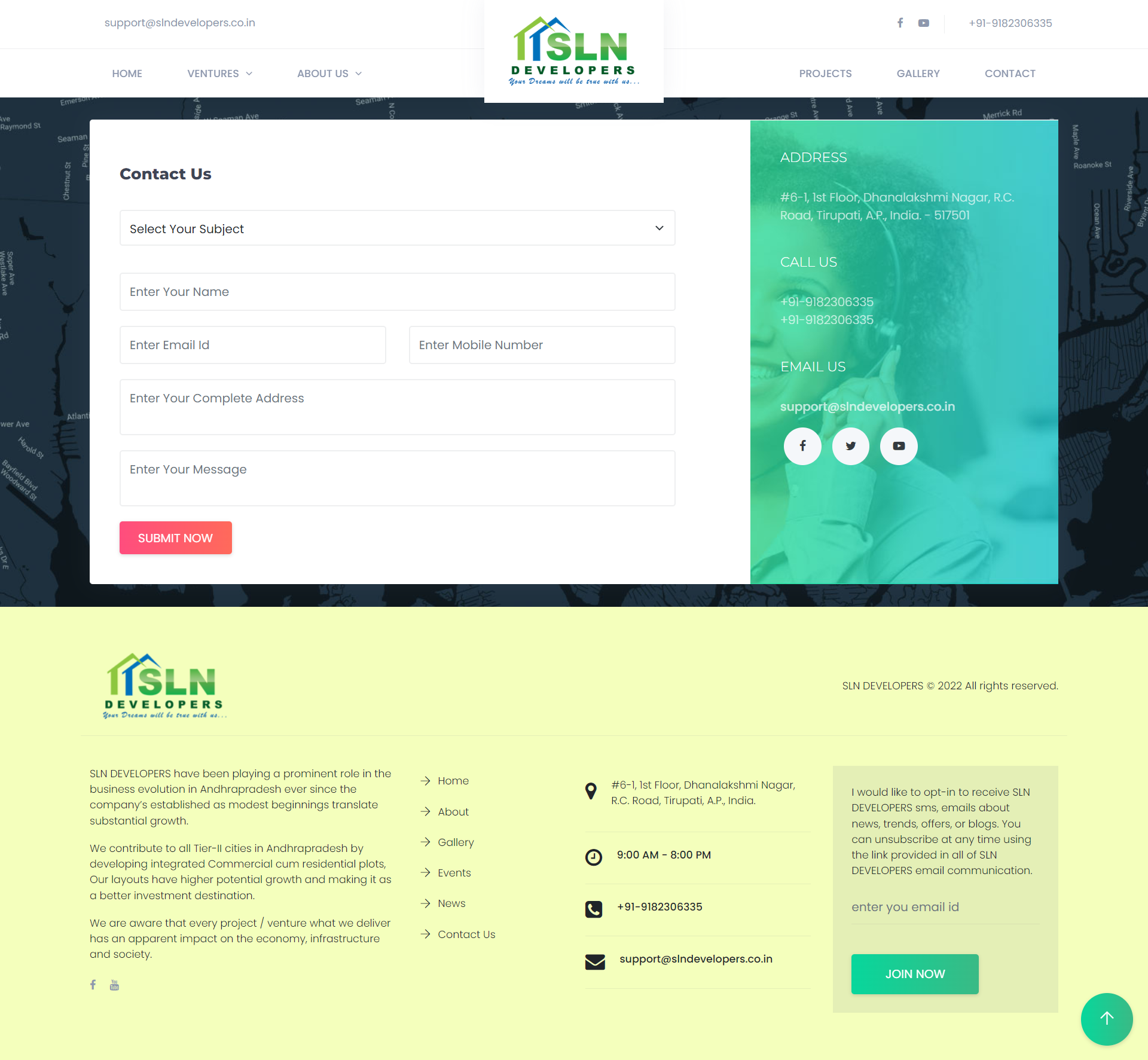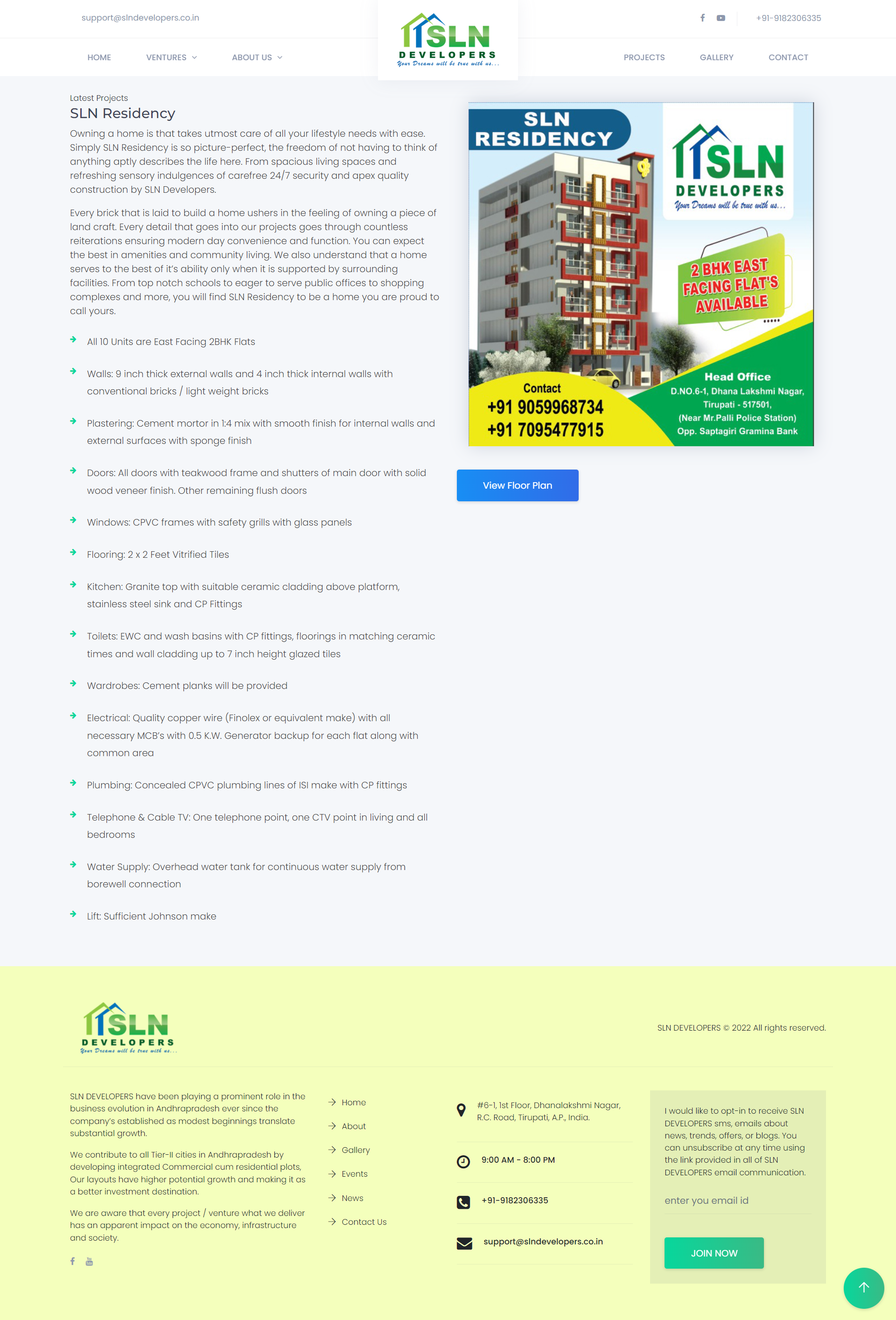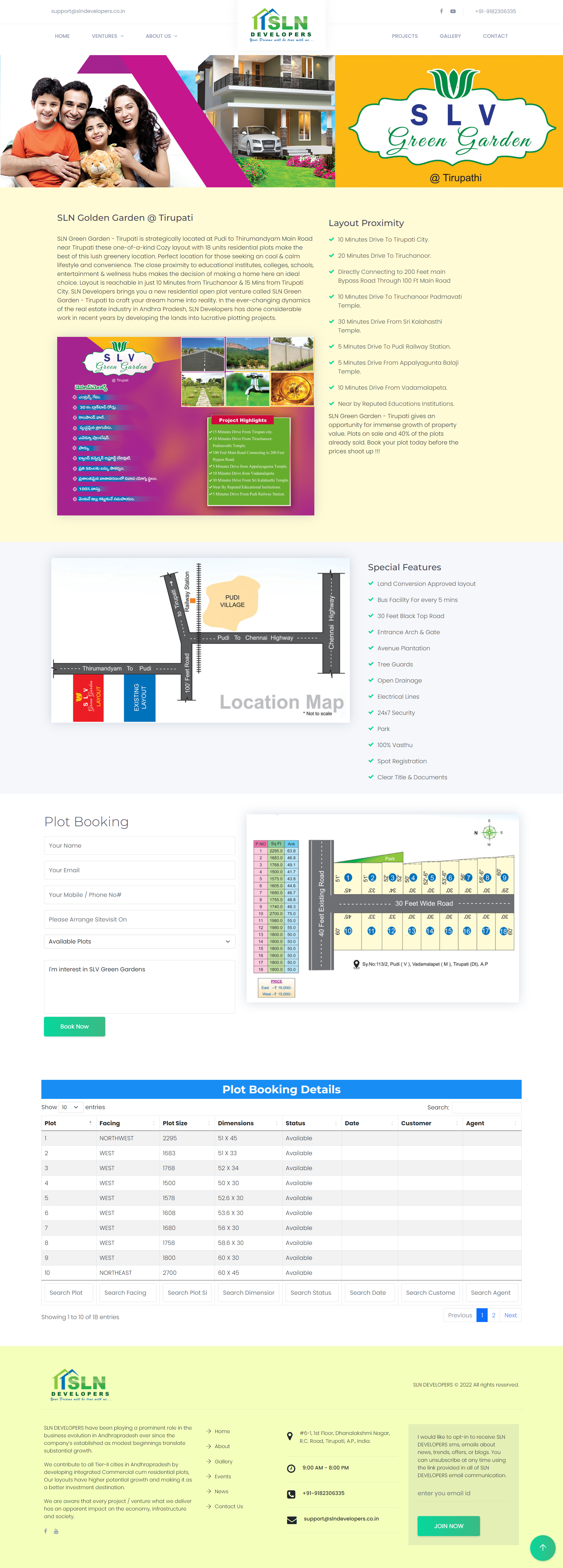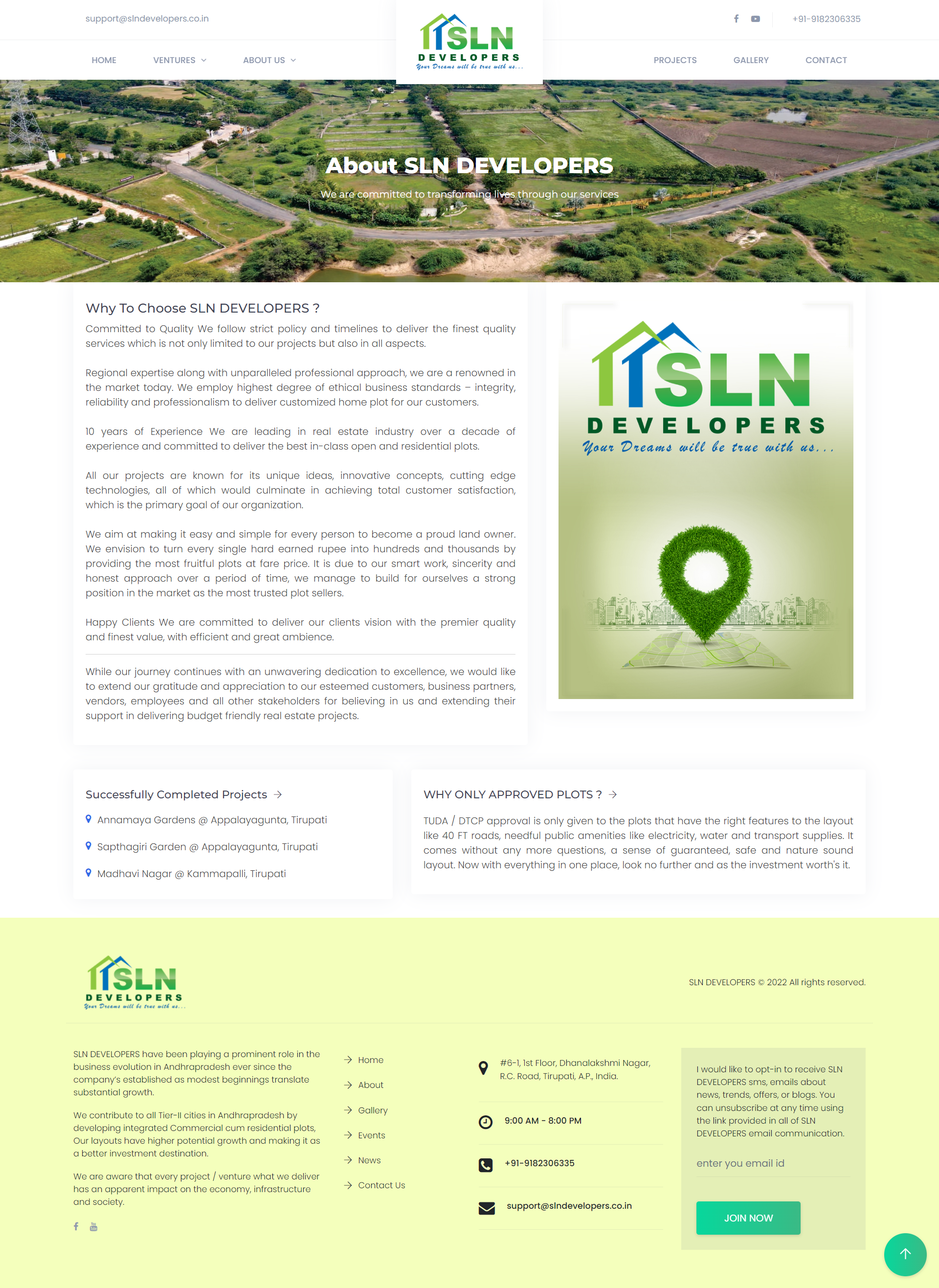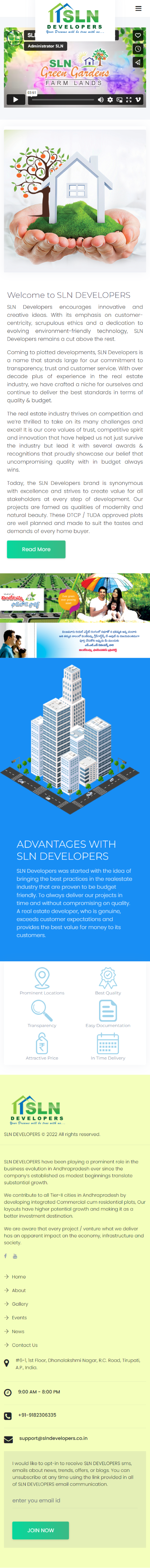 SLN DEVELOPERS have been playing a prominent role in the business evolution in Andhrapradesh ever since the companyβs established as modest beginnings translate substantial growth. We contribute to all Tier-II cities in Andhrapradesh by developing integrated Commercial cum residential plots, Our layouts have higher potential growth and making it as a better investment destination.